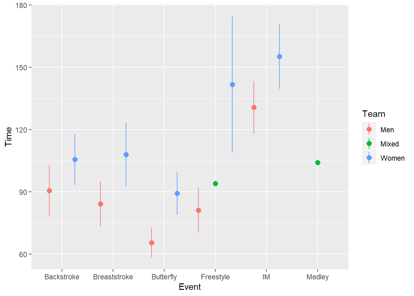 ggplot(mapping = aes(x = Event, y = Time, col = Team)) +