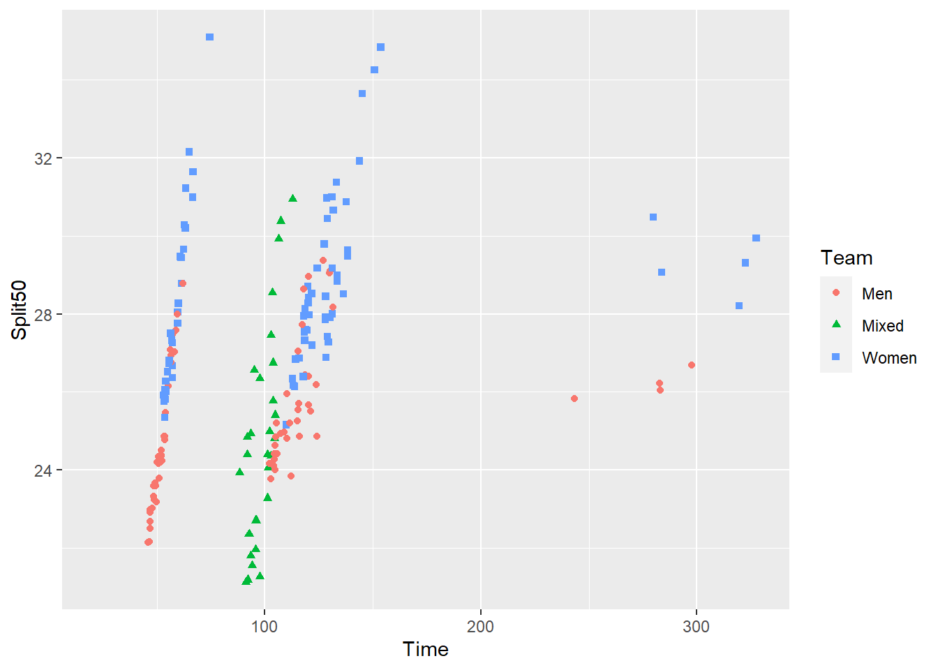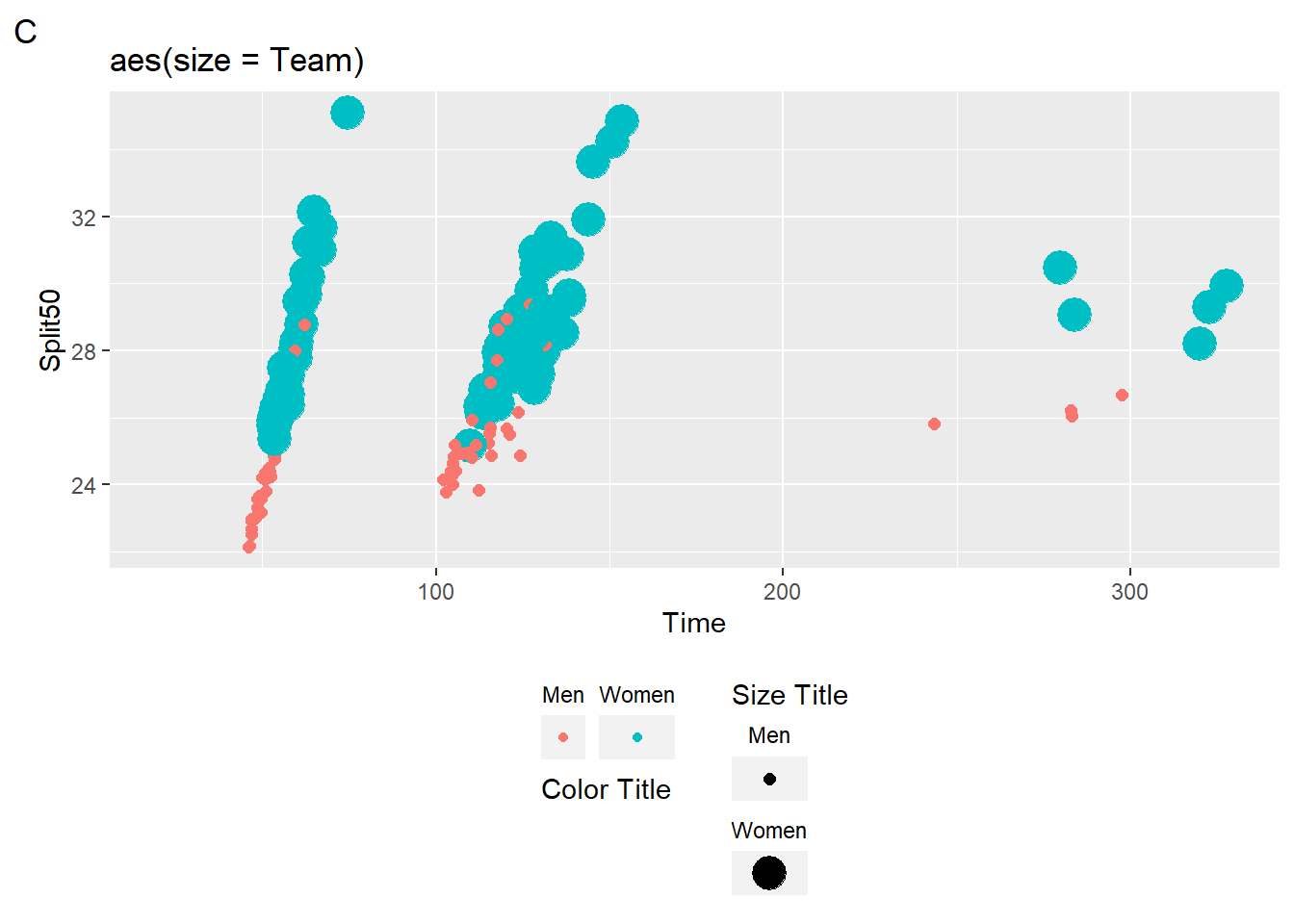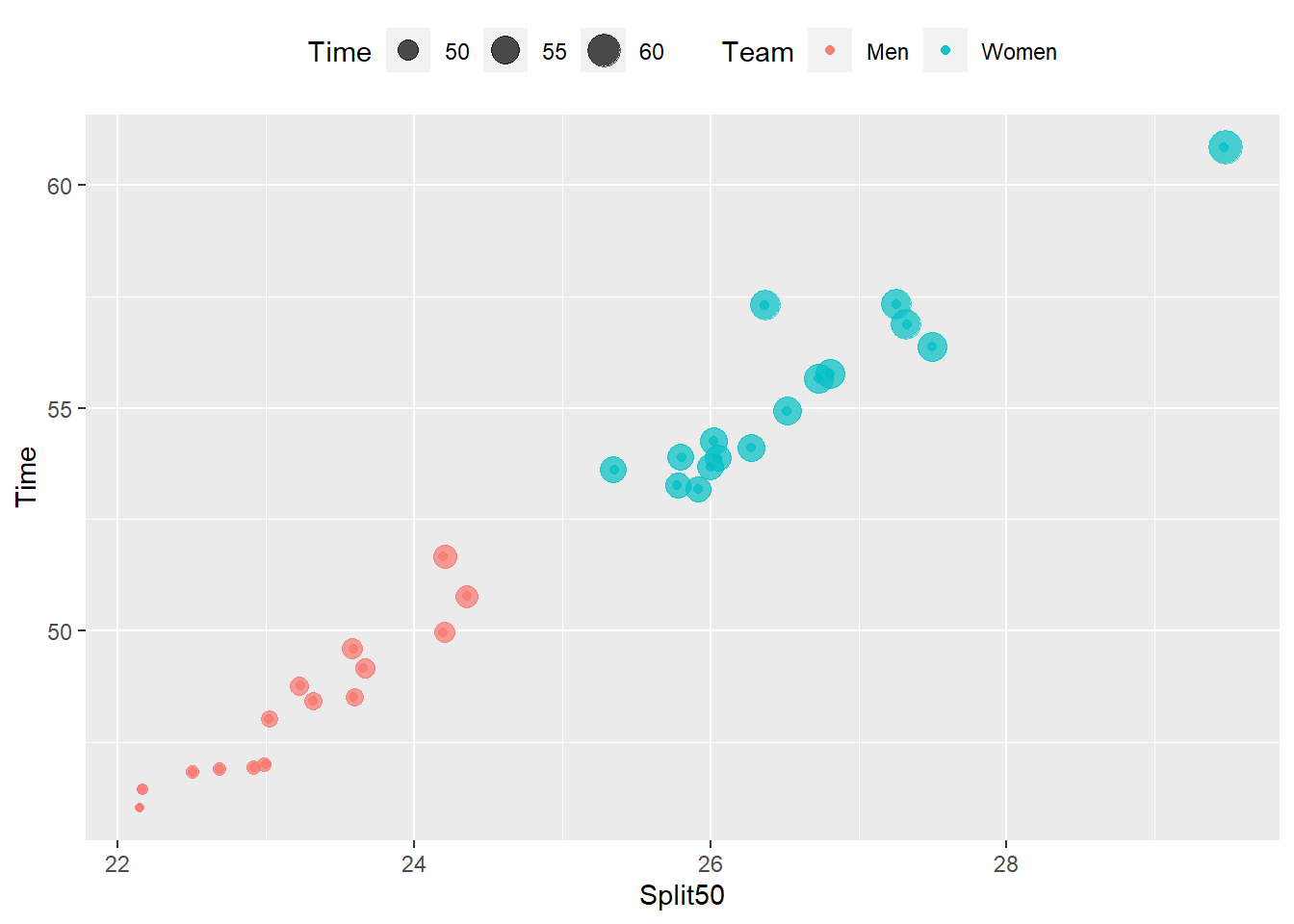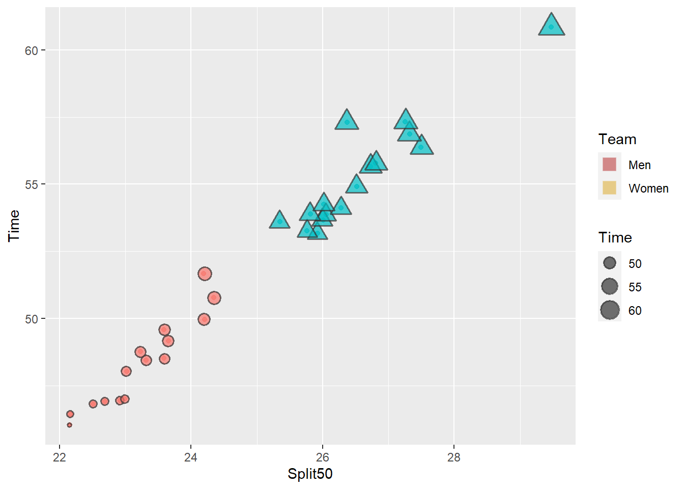 In this plot, the legend label order is opposite that of the data. Men are faster than Women so processing the fill and the shape aesthetics but the legend is arranged in the reversed order. There is no utility in ordering the labels in a way that increases the cognitive demand on the user. Not paying attention to such issues may result in your plots being less effective than is necessary. Although there are often desirable difficulties associated with increased cognitive effort, the trade off here is a misinterpretation of the plot.