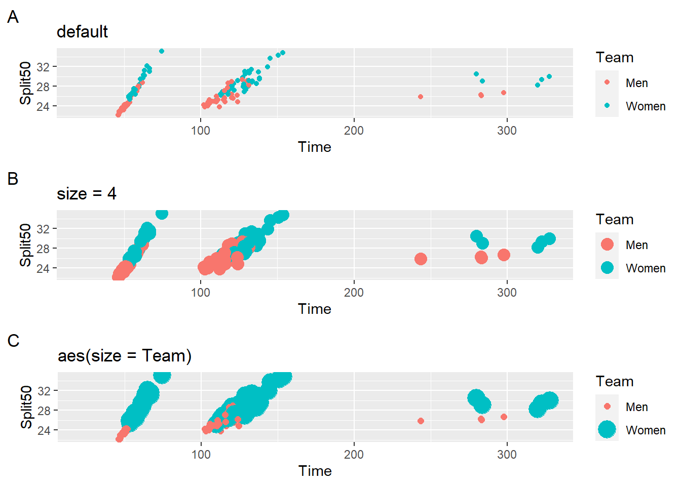 Plot D: We can also create a plot for which we map the same variable to different aesthetics. Here, Team to col, size, and shape. Because all of the aesthetics are mapped to the same variable, there is only one legend that encodes all three aesthetics.