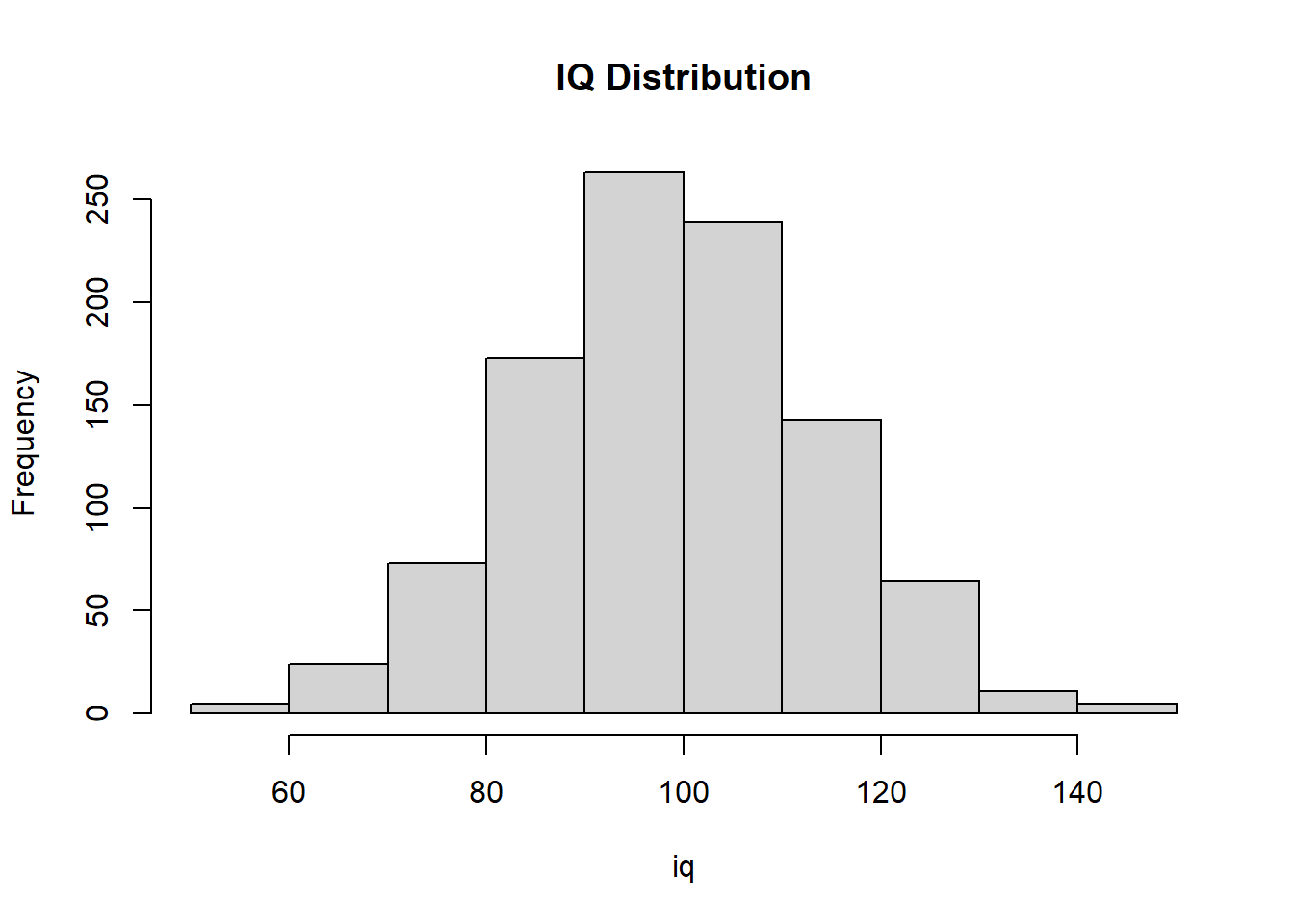 iq <- rnorm(n = 1000, mean = 100, sd = 15) Remember, as long as the order is correct, you do not have to specify the parameter names. You only need to specify the arguments for the parameters.